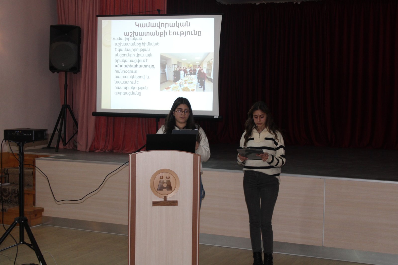 Ուսանողները ներկայացրին կամավորության արժեքը՝ ընդգծելով, որ այն ոչ միայն օգնում է հասարակությանը, այլև զարգացնում է երիտասարդի հմտությունները և պատասխանատվության զգացումը, տալիս է որոշակի աշխատանքային փորձ։